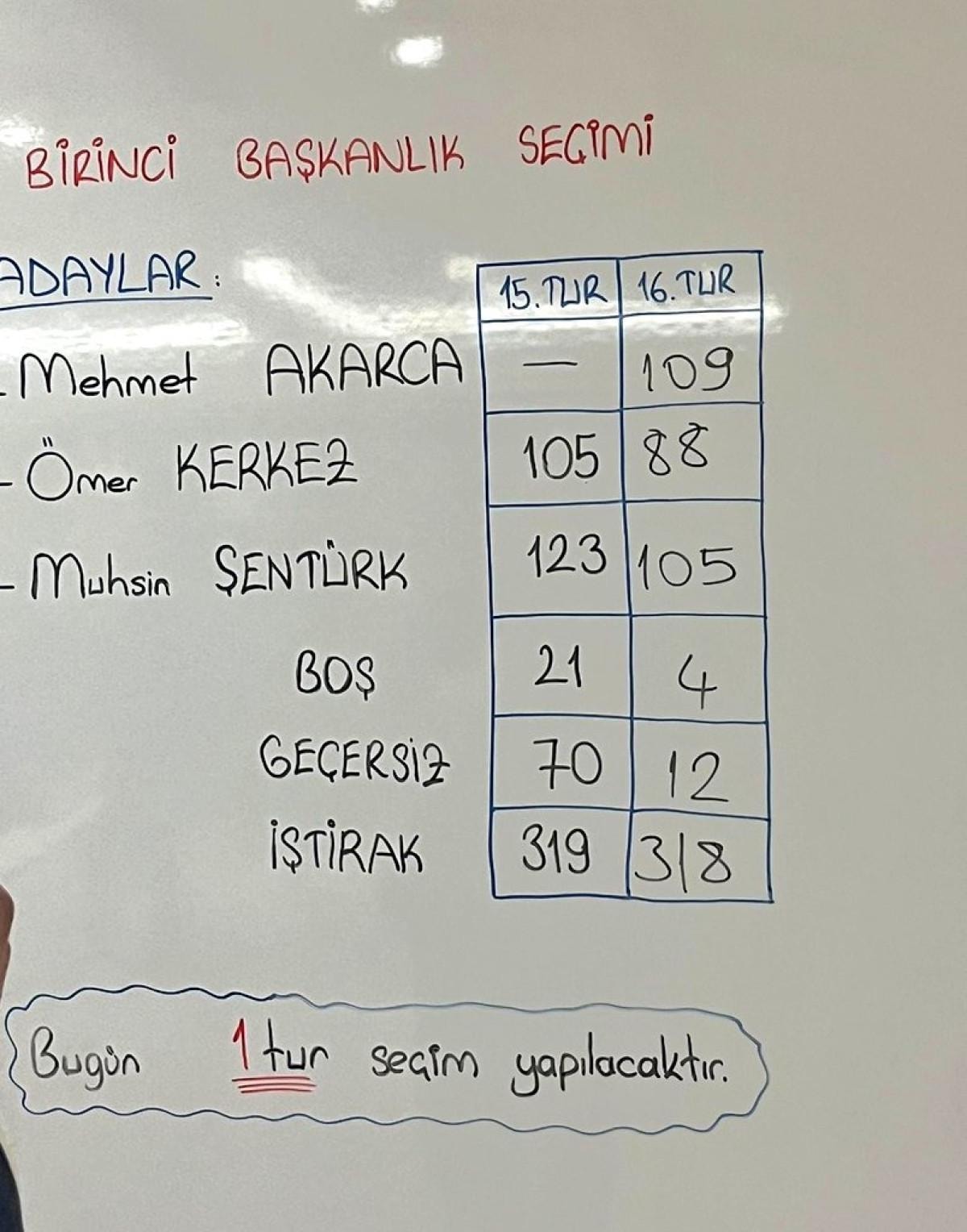 16'ncı tur oylamada; Akarca 109, Şentürk 105, Kerkez 88 oy aldı. Oylamaya 318 üye katılırken, 4 oy boş, 12 oy da geçersiz sayıldı.