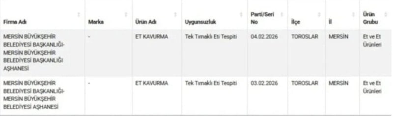 Tarım ve Orman Bakanlığı da 12 Mart’ta açıkladığı tağşiş listesinde, Mersin Büyükşehir Belediyesi’nin aşhanesinde pişirilen kavurma etinde tek tırnaklı eti saptandığını duyurdu.