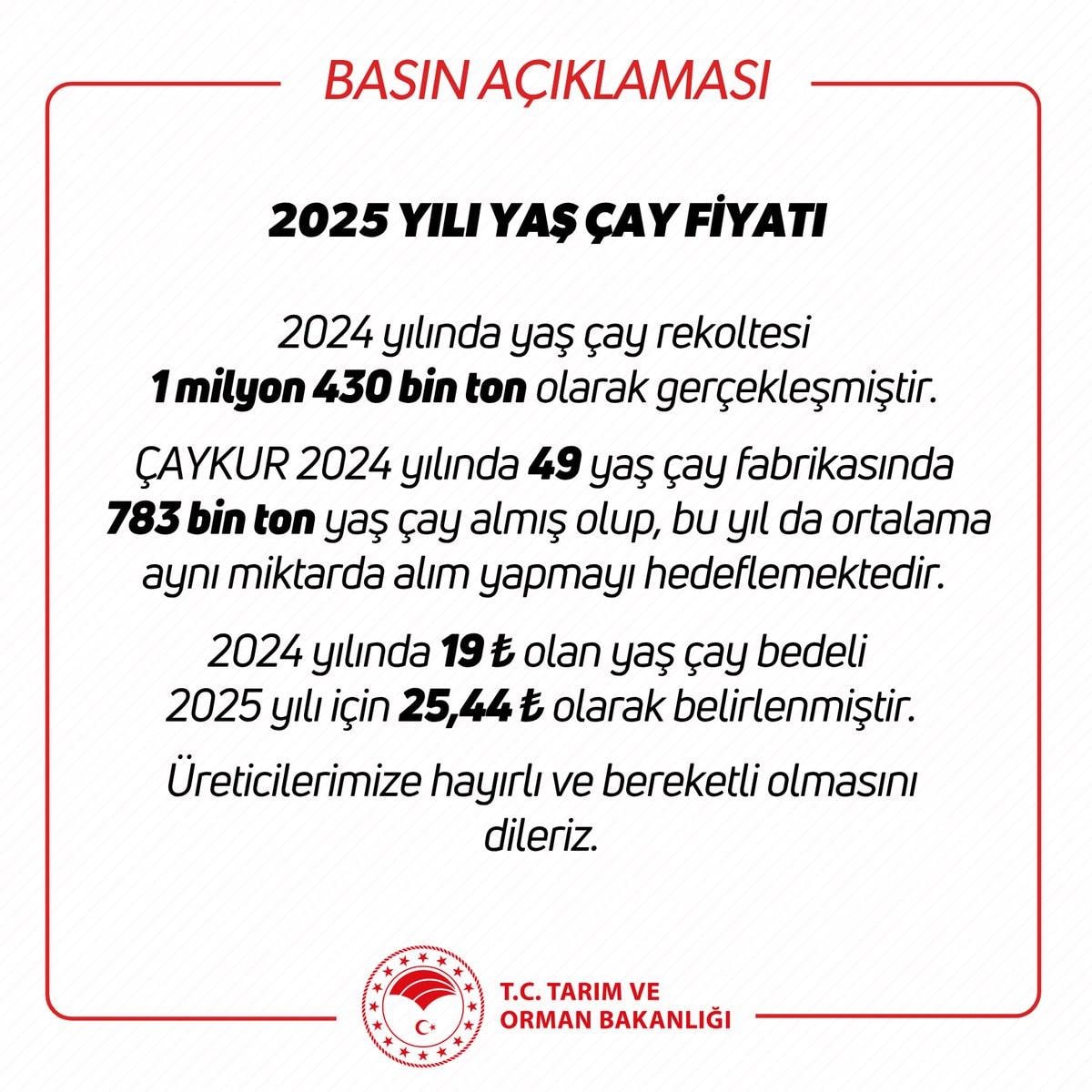 2025 yılı yaş çay alım fiyatı, kilogram başına 25,44 lira oldu. Bakanlıktan yapılan açıklamada şöyle denildi;
