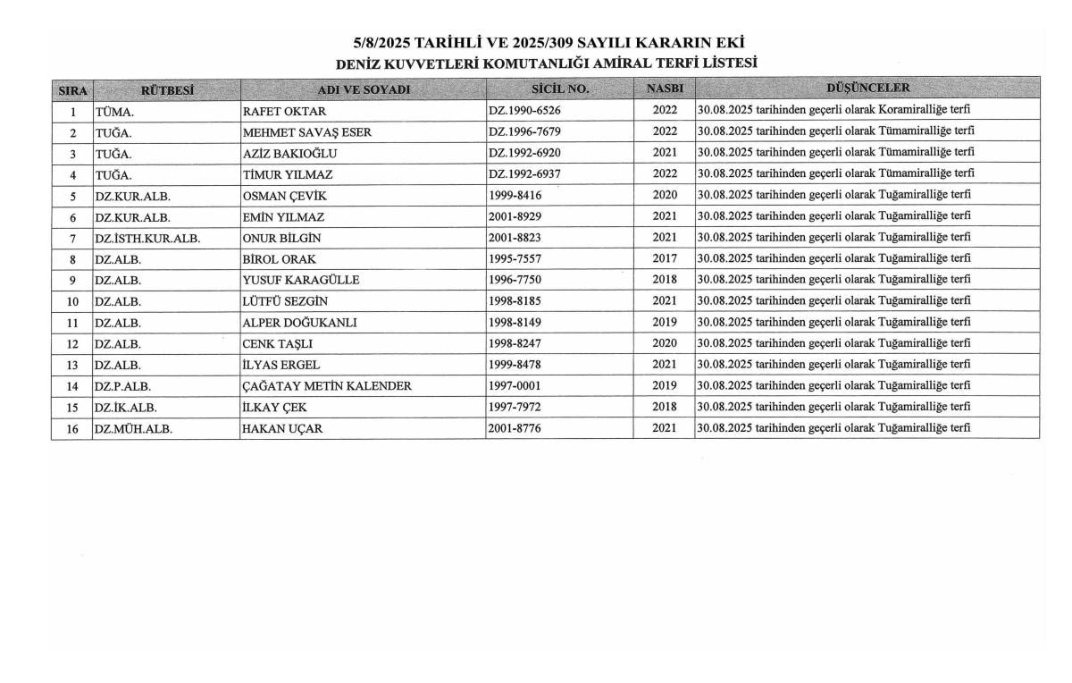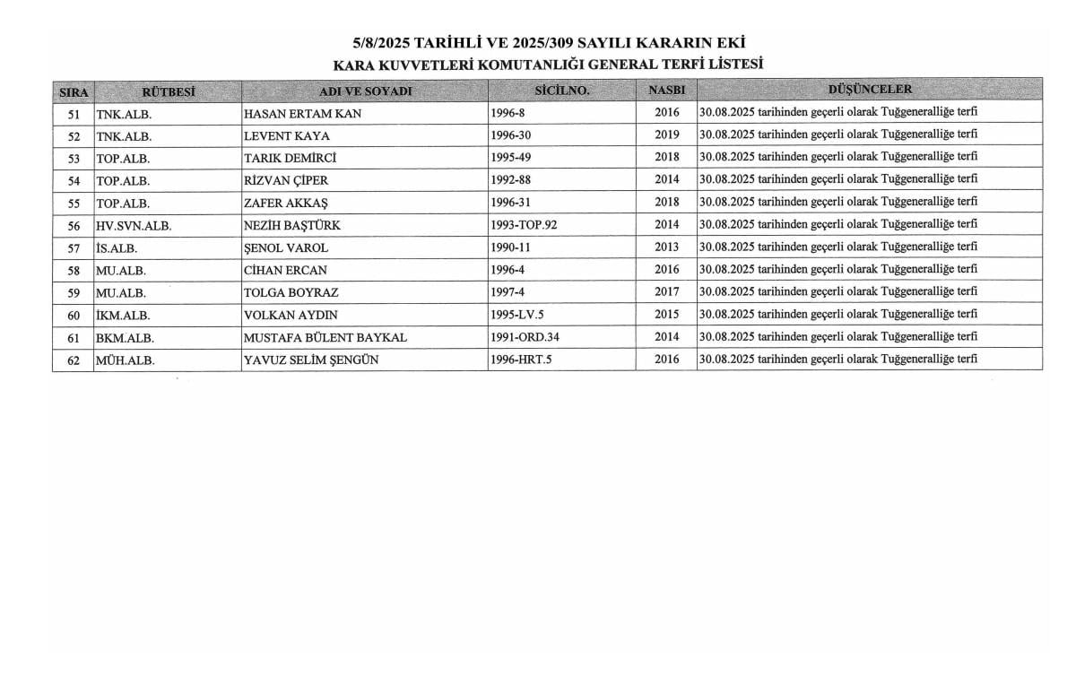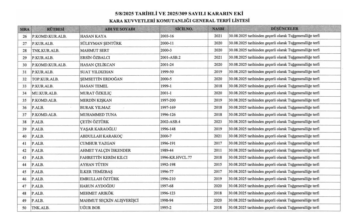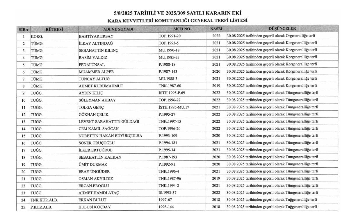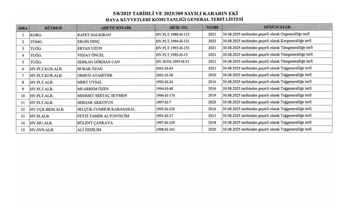 Söz konusu terfiler 30 Ağustos tarihinden itibaren geçerli olacak.