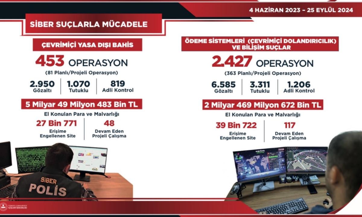 Çevrim içi yasa dışı bahis suçlarına yönelik 4 Haziran 2023-25 Eylül 2024 tarihleri arasında 453 operasyon düzenlendiğini ve operasyonların 81'inin planlı ve projeli olduğunu belirten Yerlikaya, "Bu operasyonlar sonucu 2 bin 950 şahıs gözaltına alındı, 1070'i tutuklandı, 819'u hakkında adli kontrol kararı verildi. 5 milyar 49 milyon 483 bin lira para ve malvarlığına el konuldu. 27 bin 771 site erişime engellendi." ifadelerini kullandı.