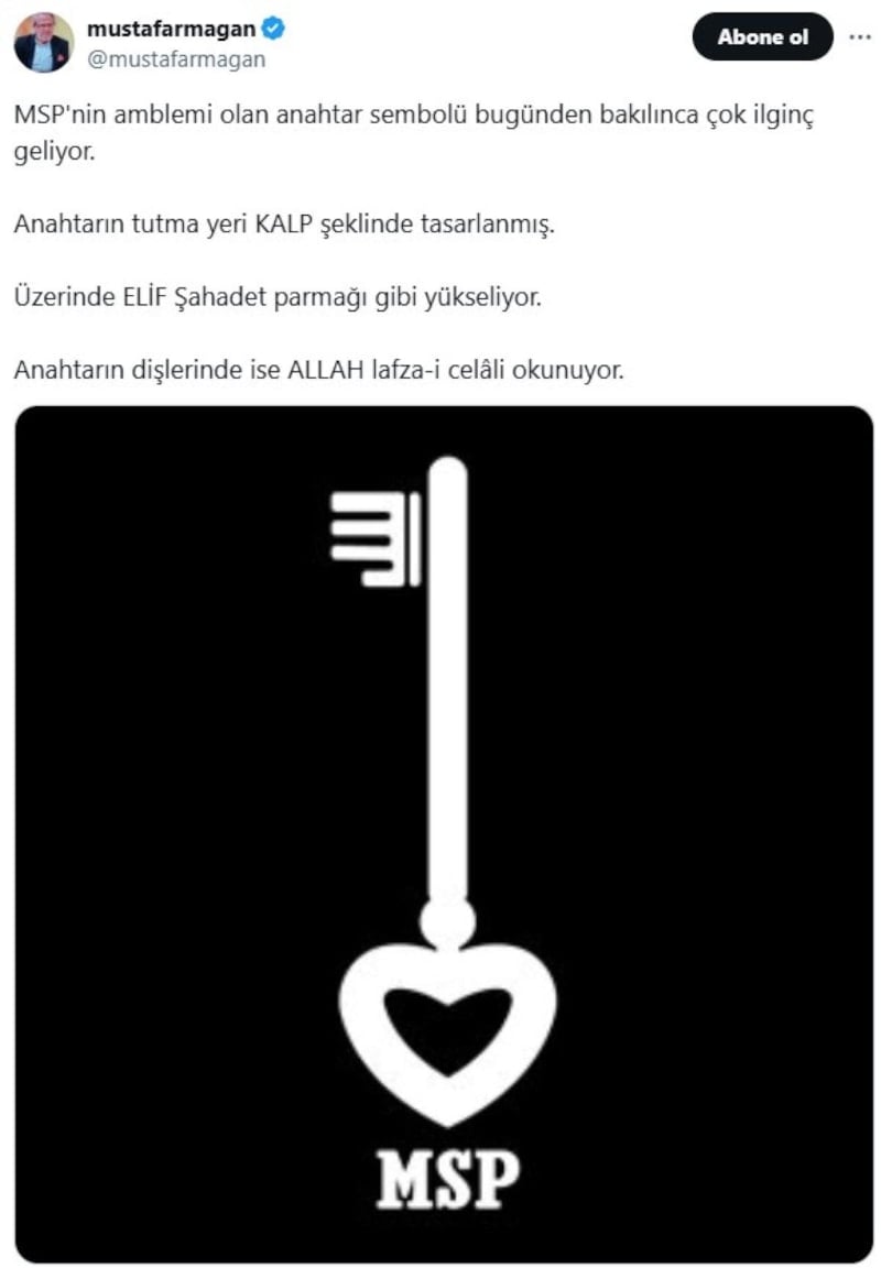 MSP'nin amblemi olan anahtar sembolü bugünden bakılınca çok ilginç geliyor. Anahtarın tutma yeri KALP şeklinde tasarlanmış. Üzerinde ELİF Şahadet parmağı gibi yükseliyor. Anahtarın dişlerinde ise ALLAH lafza-i celâli okunuyor.