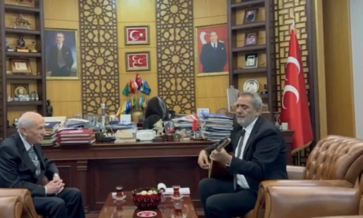 Bingöl, ziyarette 'Çeke Çeke' deyişini çaldı ve ardından bağlamasını MHP lideri Bahçeli'ye hediye etti.