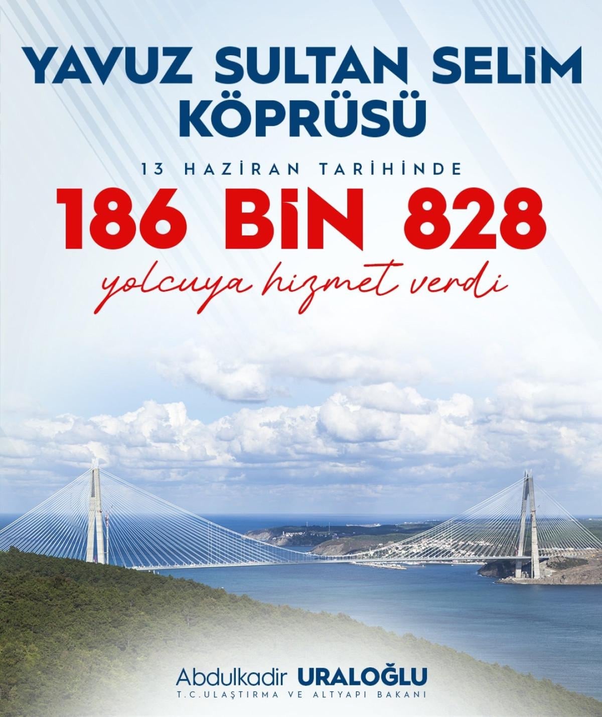 Bakan Uraloğlu, 13 Haziran Perşembe günü Yavuz Sultan Selim Köprüsü'nden 186 bin 828 araç geçişiyle yeni rekor kırıldığını da kaydetti.