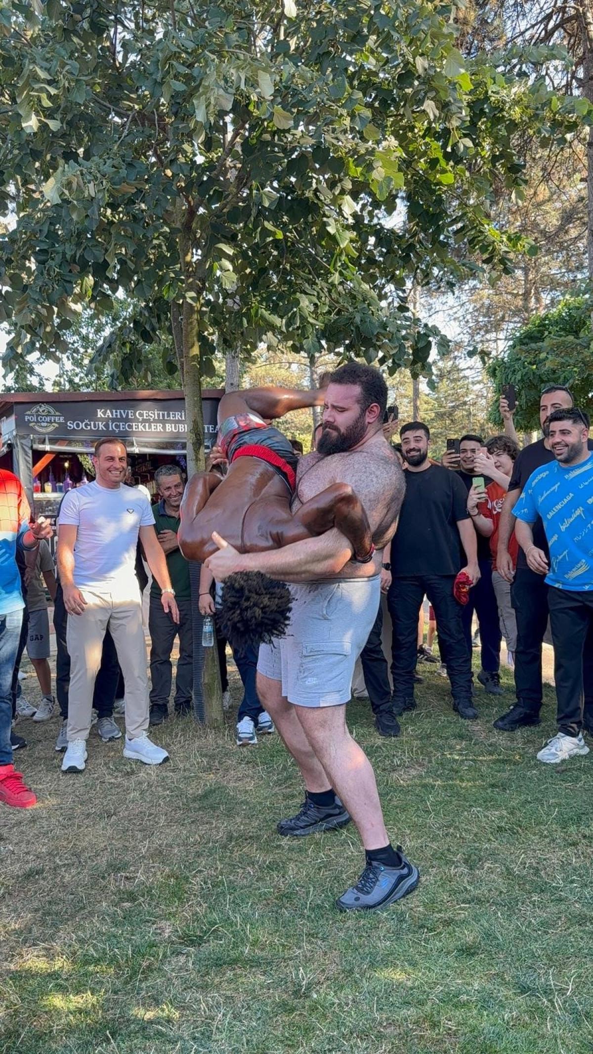 Çevredekiler yağlı güreş anlarını cep telefonlarıyla kaydetti.