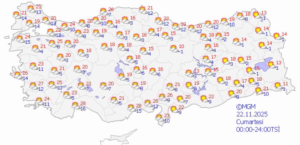 Meteoroloji yetkilileri, Cezayir üzerinden gelen sıcak hava akımının lodosla birlikte özellikle kıyı bölgelerinde hissedilir derecede etkili olacağını, 21-22 Kasım tarihlerinde birçok ilde sıcaklığın 25-29 derece bandına yükseleceğini belirtiyor.