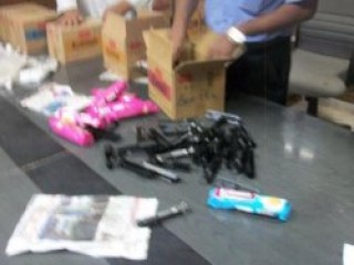 Büyük miktarda ve içinde susturucuların da olduğu iddia edilen silahlar, yetkililerin taşınan malzemenin gıda olmadığından şüphelenmesi üzerine bulundu.