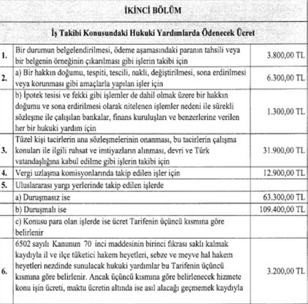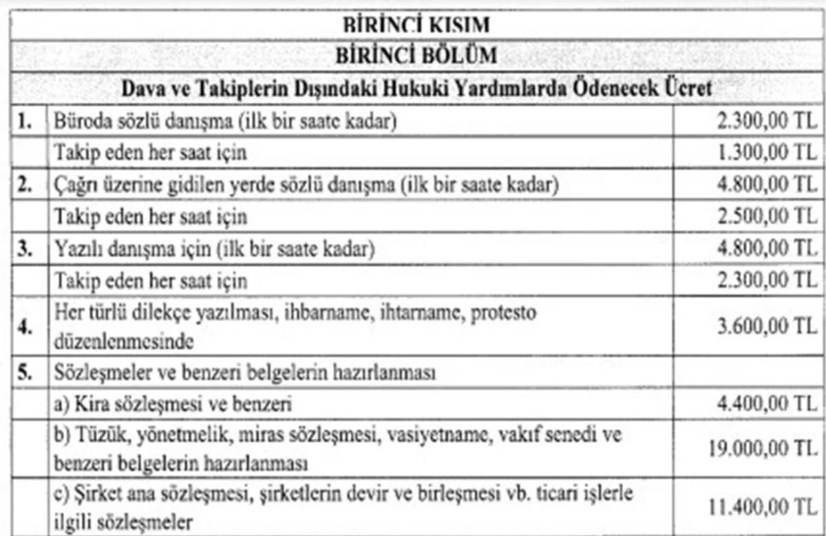 Avukatla büroda sözlü danışma ücreti ilk 1 saat için 2 bin 300 TL, sonraki her 1 saat için 1300 TL olarak belirlenirken, çağrı üzerine gidilen yerde 1 saate kadar sözlü danışma ücreti ise 4 bin 800 TL oldu.