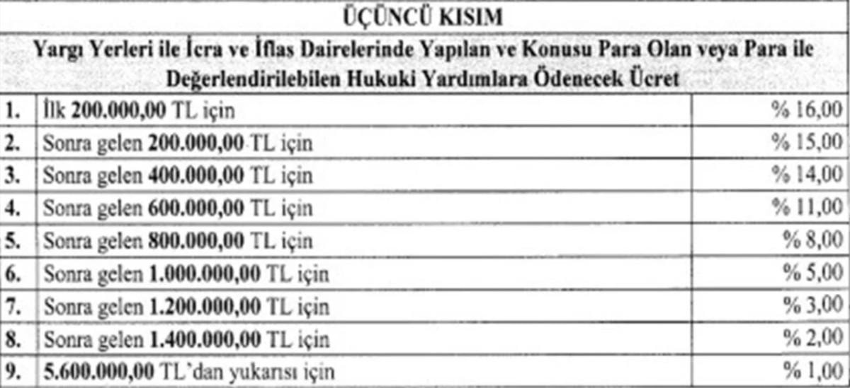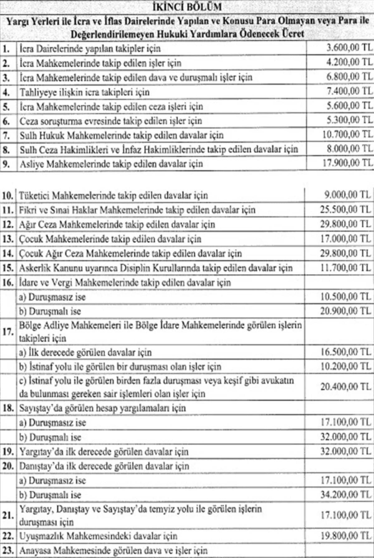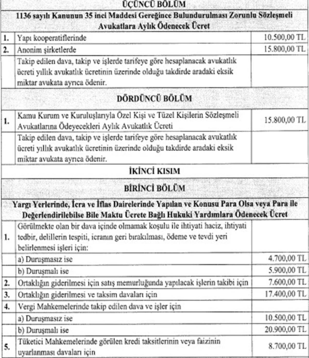 Resmi Gazete'de yayınlanarak yürürlüğe giren 'Avukatlık Asgari Ücret Tarifesi'ne göre; Kamu kurum ve kuruluşlarıyla özel ve tüzel kişilerin sözleşmeli avukatlarına ödeyecekleri ücret en az 15 bin 800 TL, dava ücretleri ise 8 bin TL ile 67 bin 700 TL arasında olacak.