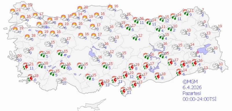 Pazartesi ve salı günleri, yurdun batı kesimlerinde parçalı bulutlu bir gökyüzü hakim olurken Akdeniz, İç Anadolu'nun güneyi ve Doğu Anadolu bölgelerinde, yerel sağanak ve gök gürültülü sağanak yağışlar görülecek.