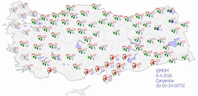 Doğu Anadolu Bölgesi'nin yüksek kesimlerinde ve bazı illerinde (Erzurum, Kars, Ardahan çevresi) yağışların karla karışık yağmur ve kar şeklinde görüleceği tahmin ediliyor.