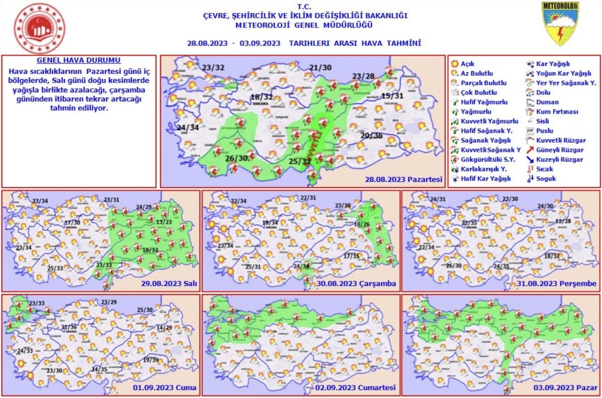 Meteoroloji Genel Müdürlüğü tarafından yeni haftadaki hava durumu tahminlerine ilişkin yapılan yapılan paylaşımda ise "Hava sıcaklıklarının pazartesi günü iç kesimlerde, salı günü doğu kesimlerde yağışla birlikte azalacağı, çarşamba gününden itibaren tekrar artacağı tahmin ediliyor." denildi.