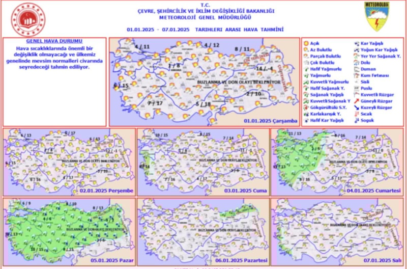 Hafta sonu beklenen günün en yüksek sıcaklık değerleri Ankara'da 6, İstanbul'da 9, İzmir'de 13, Antalya ve Adana'da 15, Samsun'da 10, Diyarbakır'da 5 derece civarında seyredecek.
