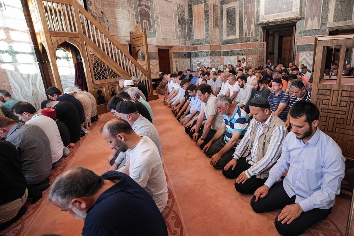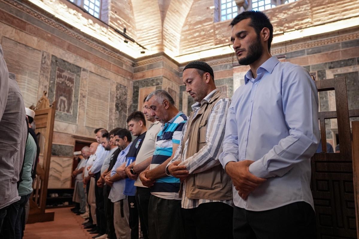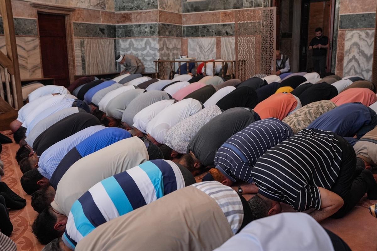 Caminin içini dolduran cemaat, namaz için dışarıya serilen seccadelerde de saf tuttu.