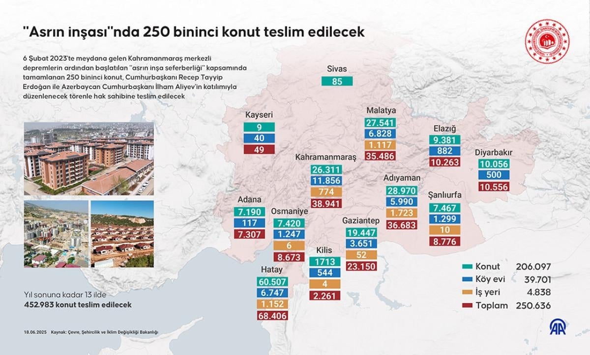 Bakanlıktan yapılan açıklamaya göre, yarın Kahramanmaraş'ta "250 Bininci Afet Konutu Anahtar Teslimi ve Kura Çekimi Töreni", Azerbaycan hükümeti ve TOKİ iş birliğiyle inşa edilen Azerbaycan Mahallesi'nde 19 Haziran’da (yarın) düzenlenecek.