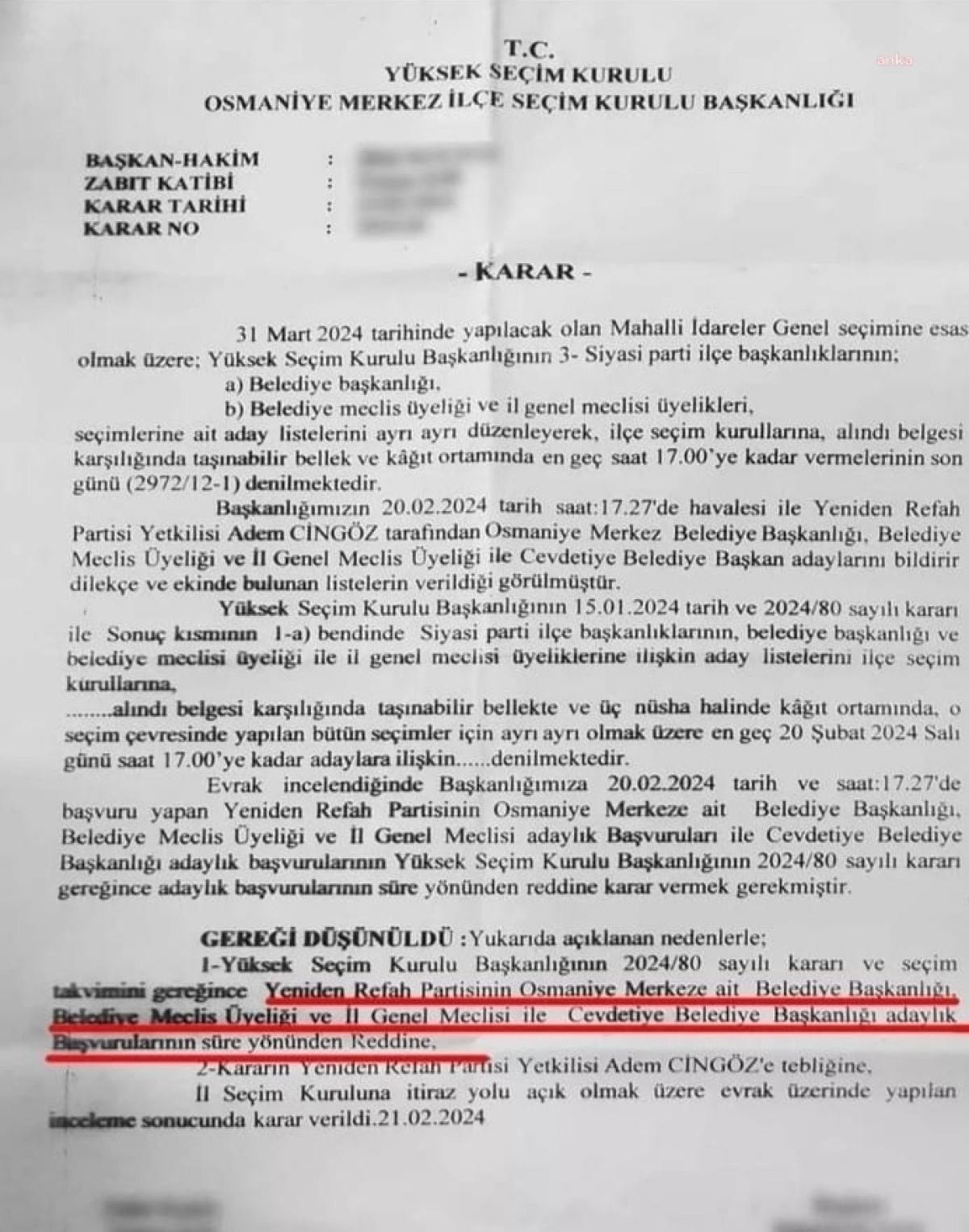 Yeniden Refah Partisi'nin Osmaniye Merkez Belediye Başkanlığı, Belediye Meclis Üyeliği, İl Genel Meclisi ile Cevdetiye Belediye Başkanlığı, Toprakkale Belediye Baskanlığı, Hasanbeyli Belediye Başkanlığı adaylık başvuruları, İl Seçim Kurulu’na 20 Şubat’ta saat 17.27’de teslim edildi.