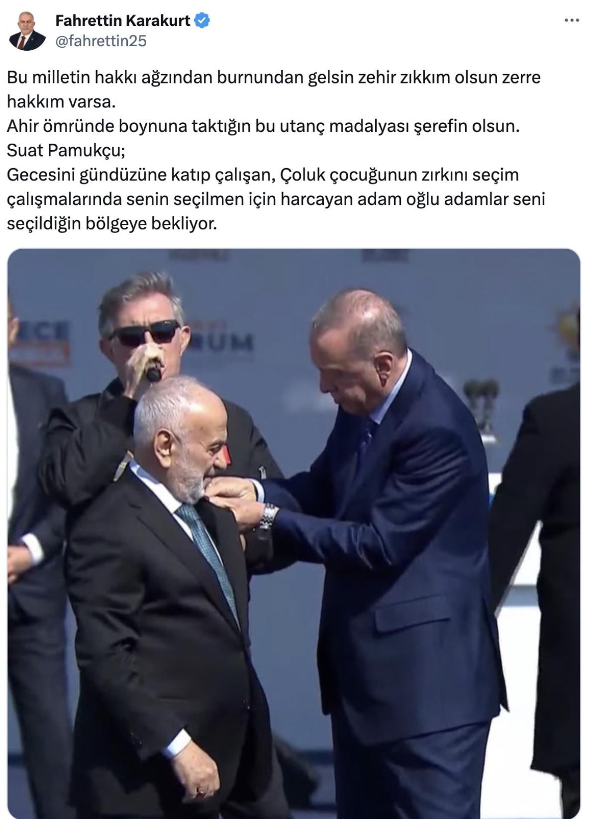 Bu milletin hakkı ağzından burnundan gelsin zehir zıkkım olsun zerre hakkım varsa. Ahir ömründe boynuna taktığın bu utanç madalyası şerefin olsun. Suat Pamukçu; gecesini gündüzüne katıp çalışan, çoluk çocuğunun rızkını seçim çalışmalarında senin seçilmen için harcayan adam oğlu adamlar seni seçildiğin bölgeye bekliyor.