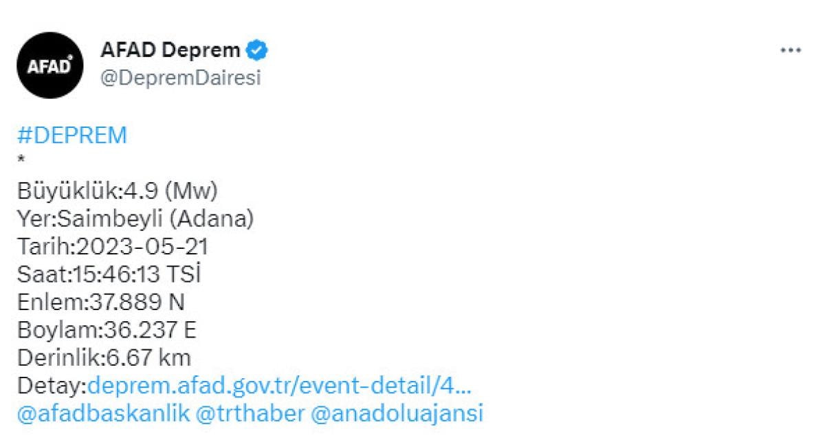 Sezer, "Adana ilimiz Saimbeyli ilçesinde saat 15:46'da meydana gelen 4,9 büyüklüğündeki artçı #deprem sonrasında, an itibarıyla olumsuz bir durum bulunmamaktadır. Saha tarama çalışmaları devam etmektedir. Etkilenen vatandaşlarımıza geçmiş olsun dileklerimizi sunarım." ifadelerini kullandı.