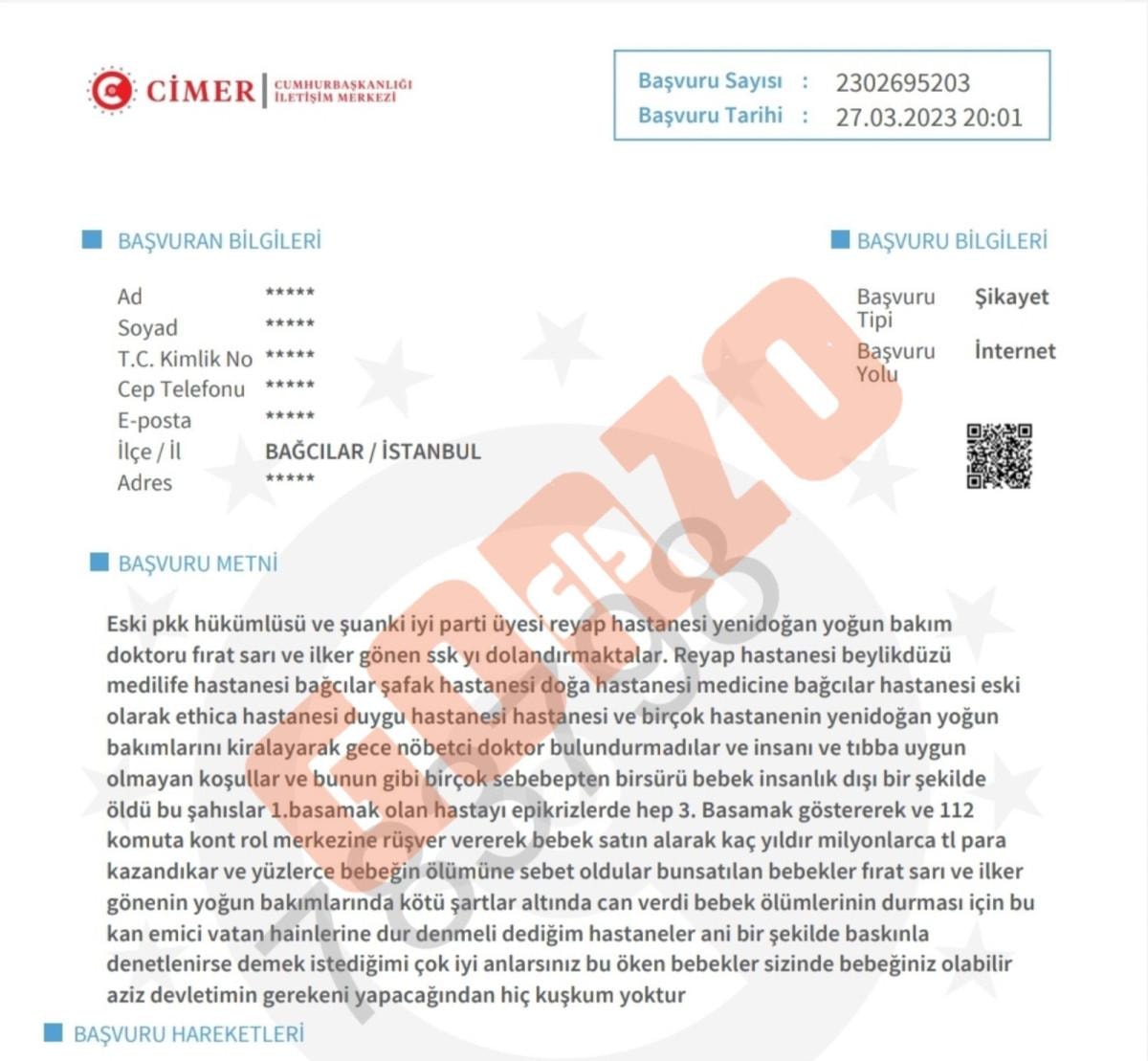 Yenidoğan yoğun bakımlarında bir terslik olduğunu anlayan ve olayı çözen vatandaşlardan birisi, CİMER'e şikayette bulundu.