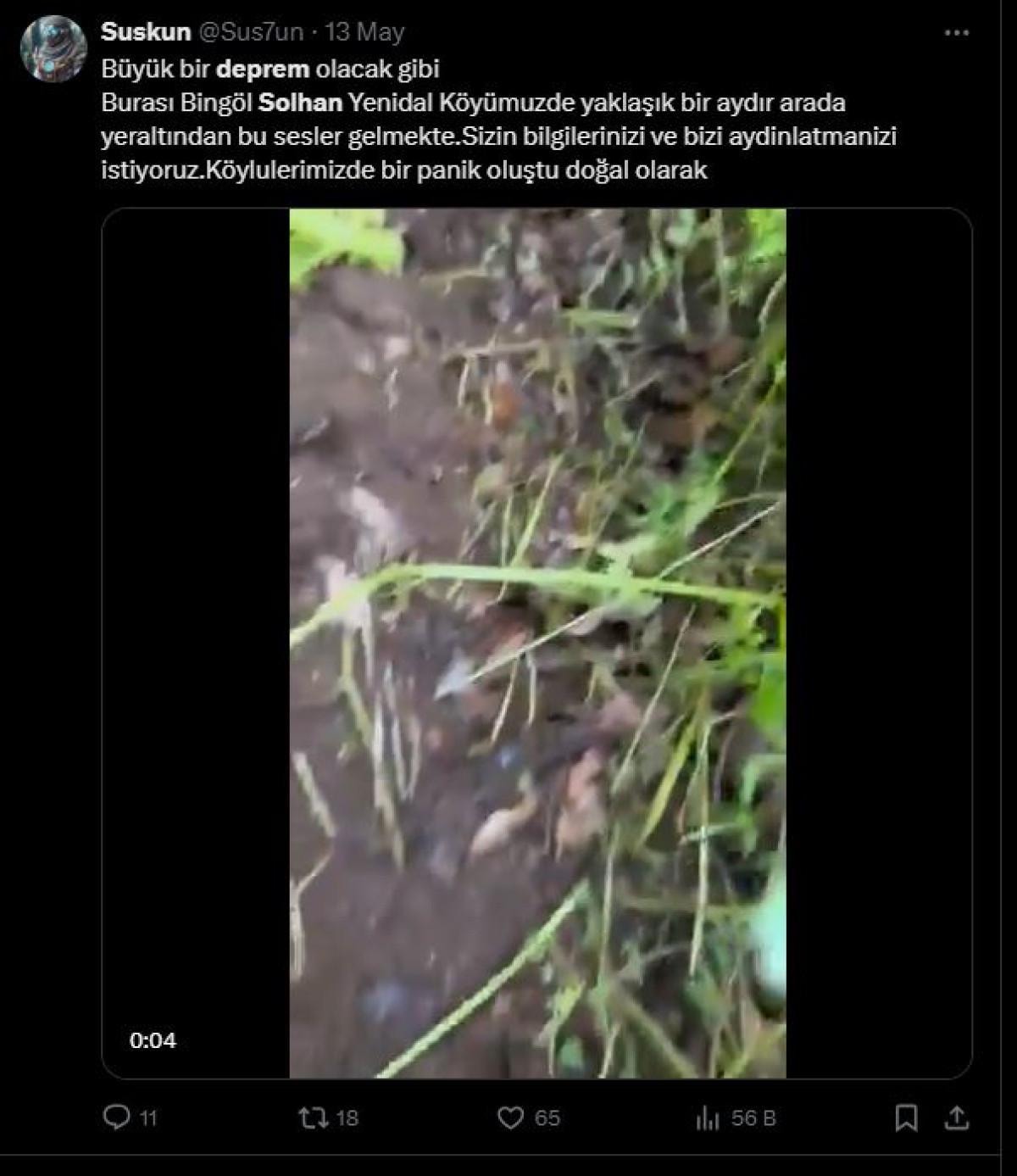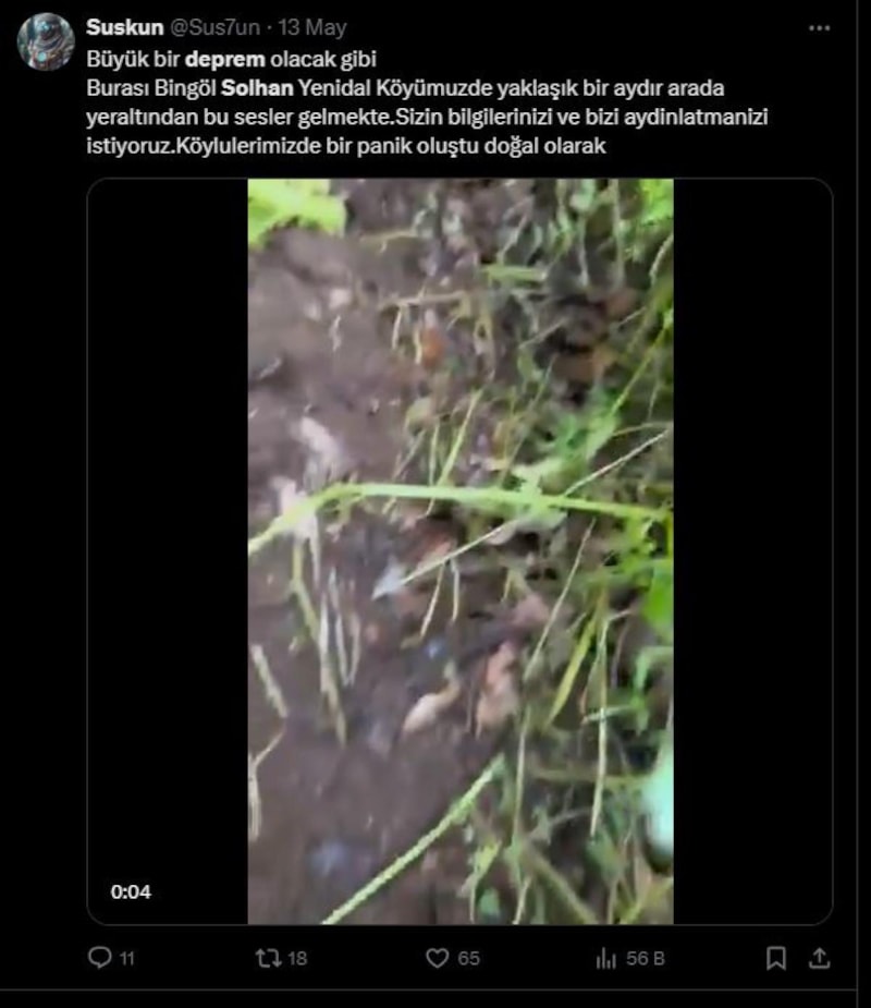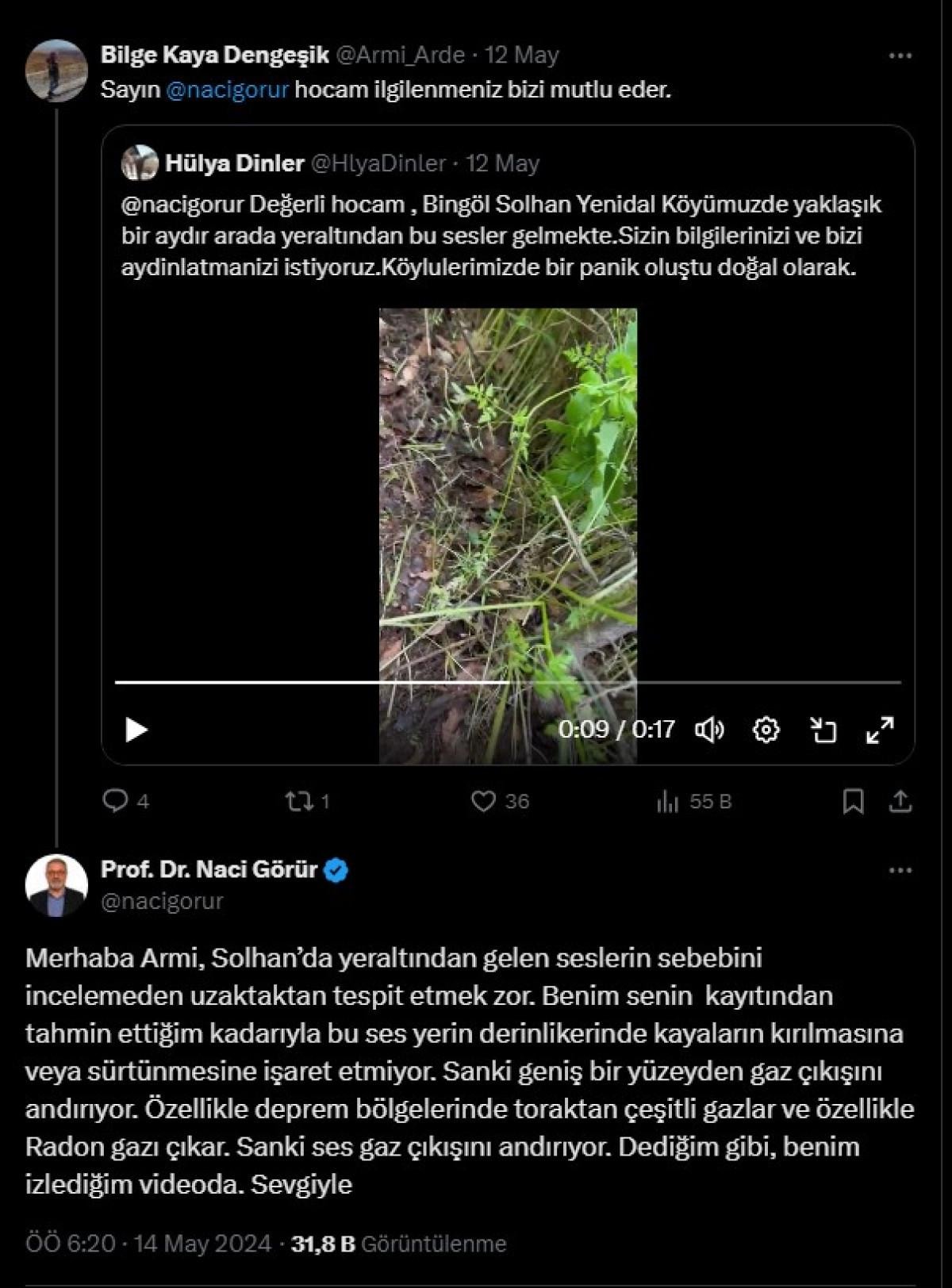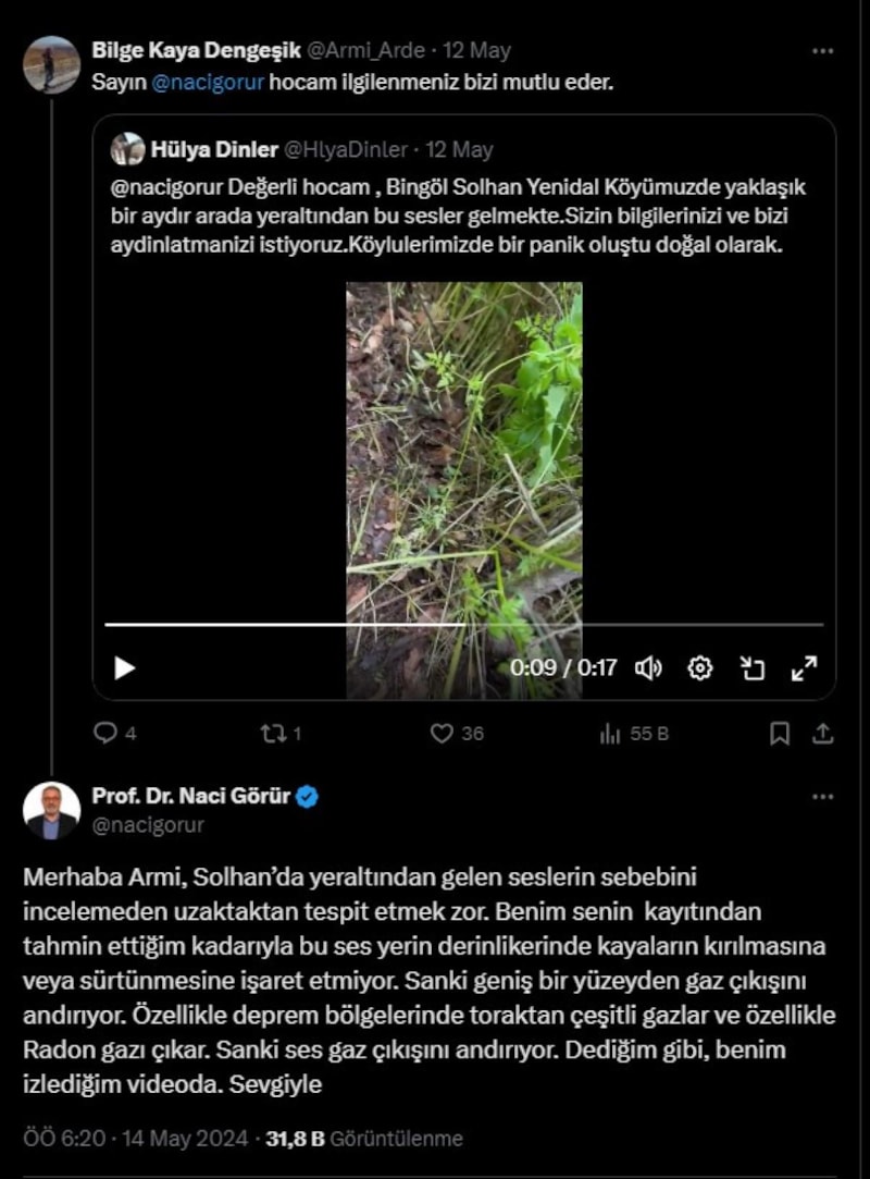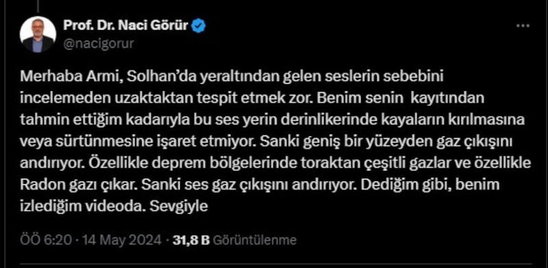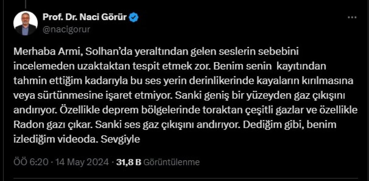 Sosyal medya platformu X’te bir kullanıcının görüntüyü paylaşarak etiketlediği Prof. Dr. Naci Görür de, “Solhan’da yer altından gelen seslerin sebebini incelemeden uzaktan tespit etmek zor. Benim senin kaydından tahmin ettiğim kadarıyla, bu ses yerin derinliklerinde kayaların kırılmasına veya sürtünmesine işaret etmiyor.