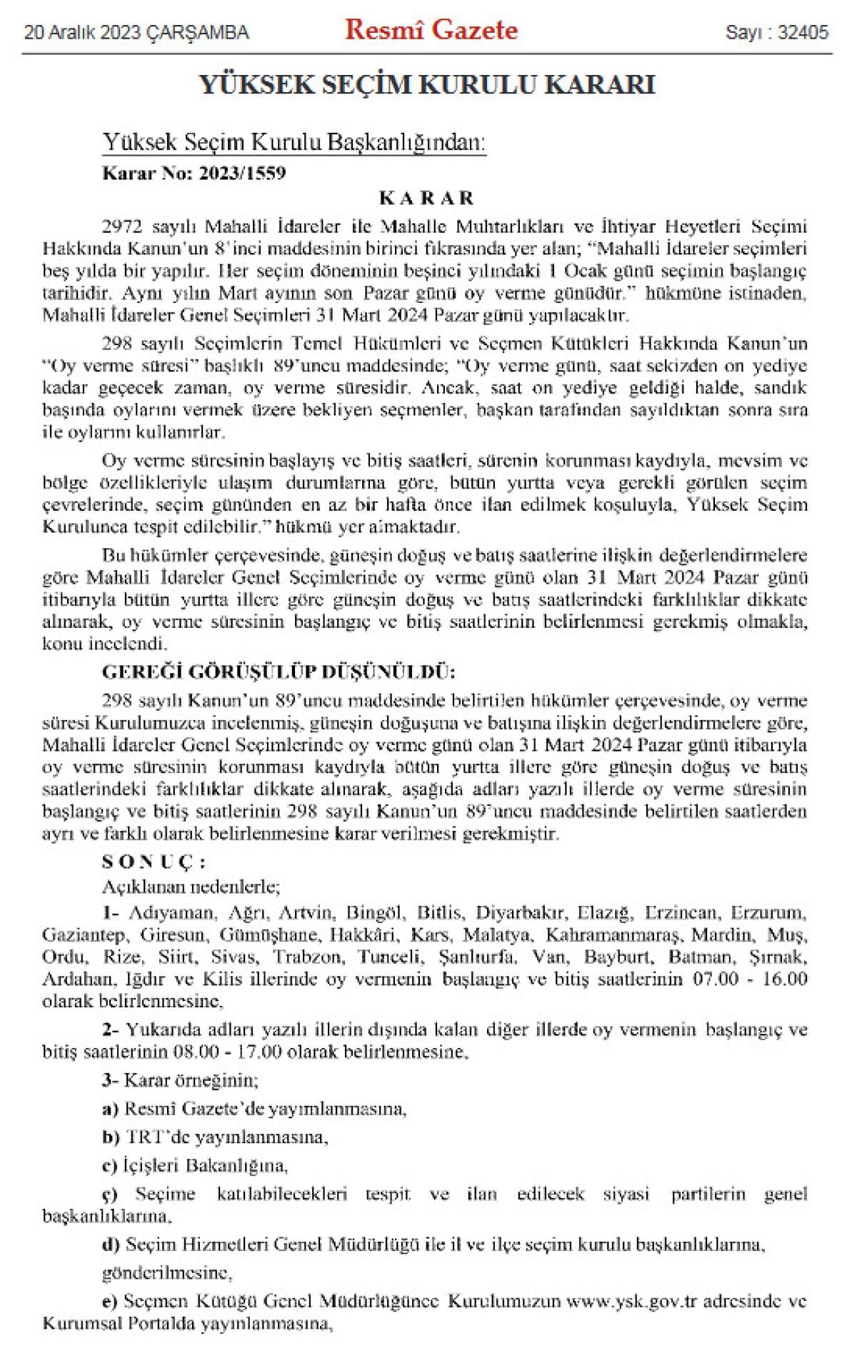 Söz konusu hükümler çerçevesinde, YSK Başkanlığınca 31 Mart tarihinde yapılacak olan yerel seçimlerde bazı illerde oy verme saatlerinde değişikliğe gidildi.