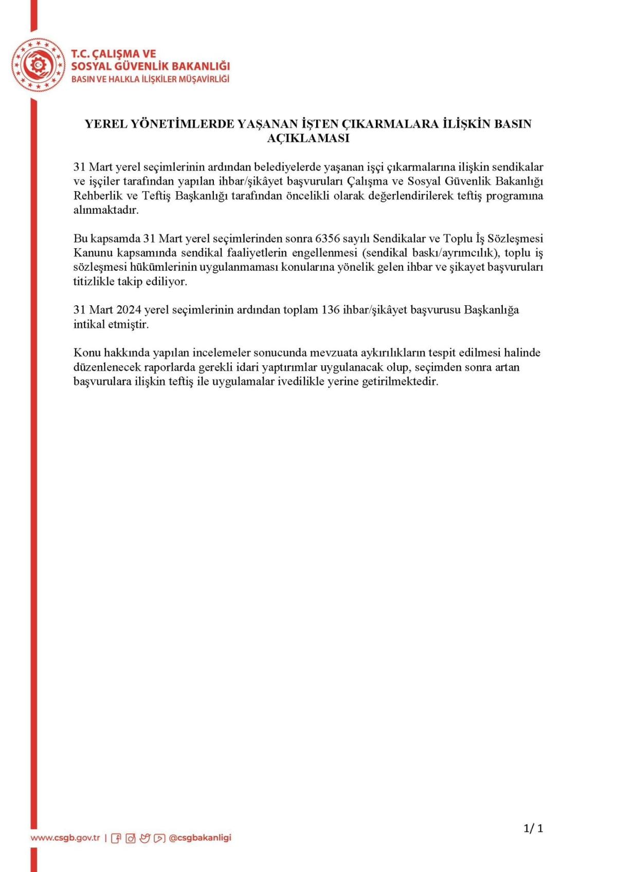 Bakanlıktan yapılan açıklamada, yerel seçimlerinin ardından belediyelerde yaşanan işçi çıkarmalarına ilişkin sendikalar ve işçiler tarafından yapılan ihbar ya da şikayet başvurularının, bakanlığın Rehberlik ve Teftiş Başkanlığı tarafından öncelikli olarak değerlendirilerek teftiş programına alındığı belirtildi.