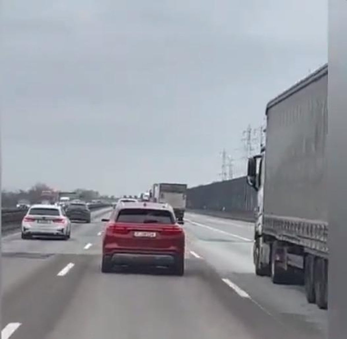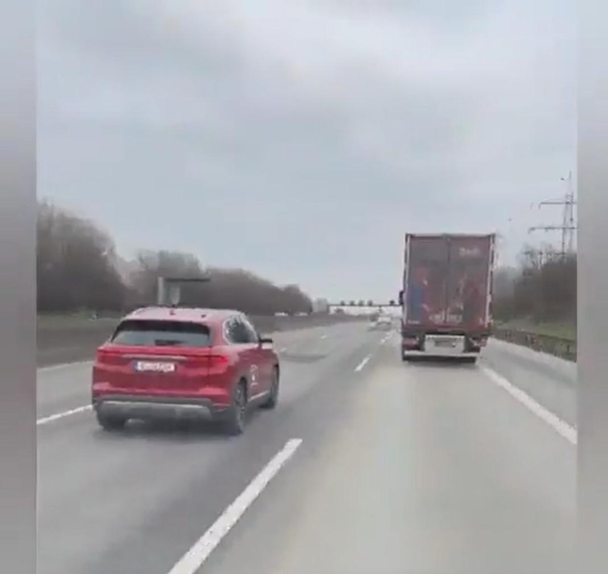 7 farklı renkte satışa sunulacak olan Togg, Almanya'nın Frankfurt şehrinde test sürüşündeyken başka bir sürücünün kamerasına yansıdı.
