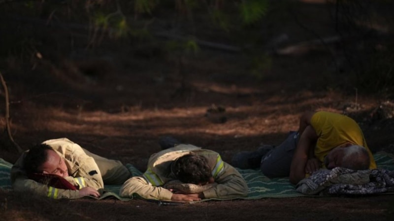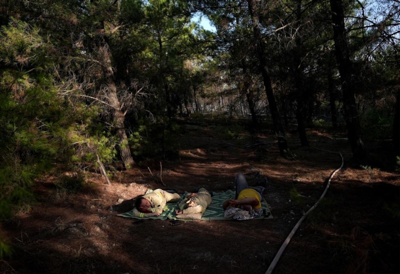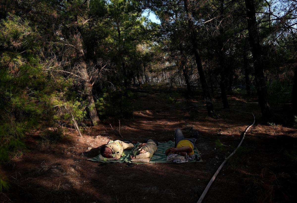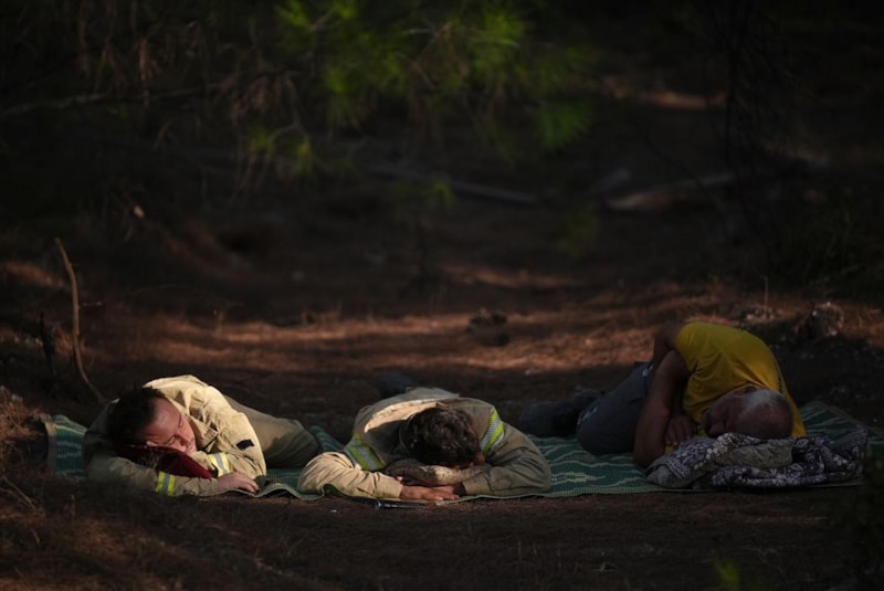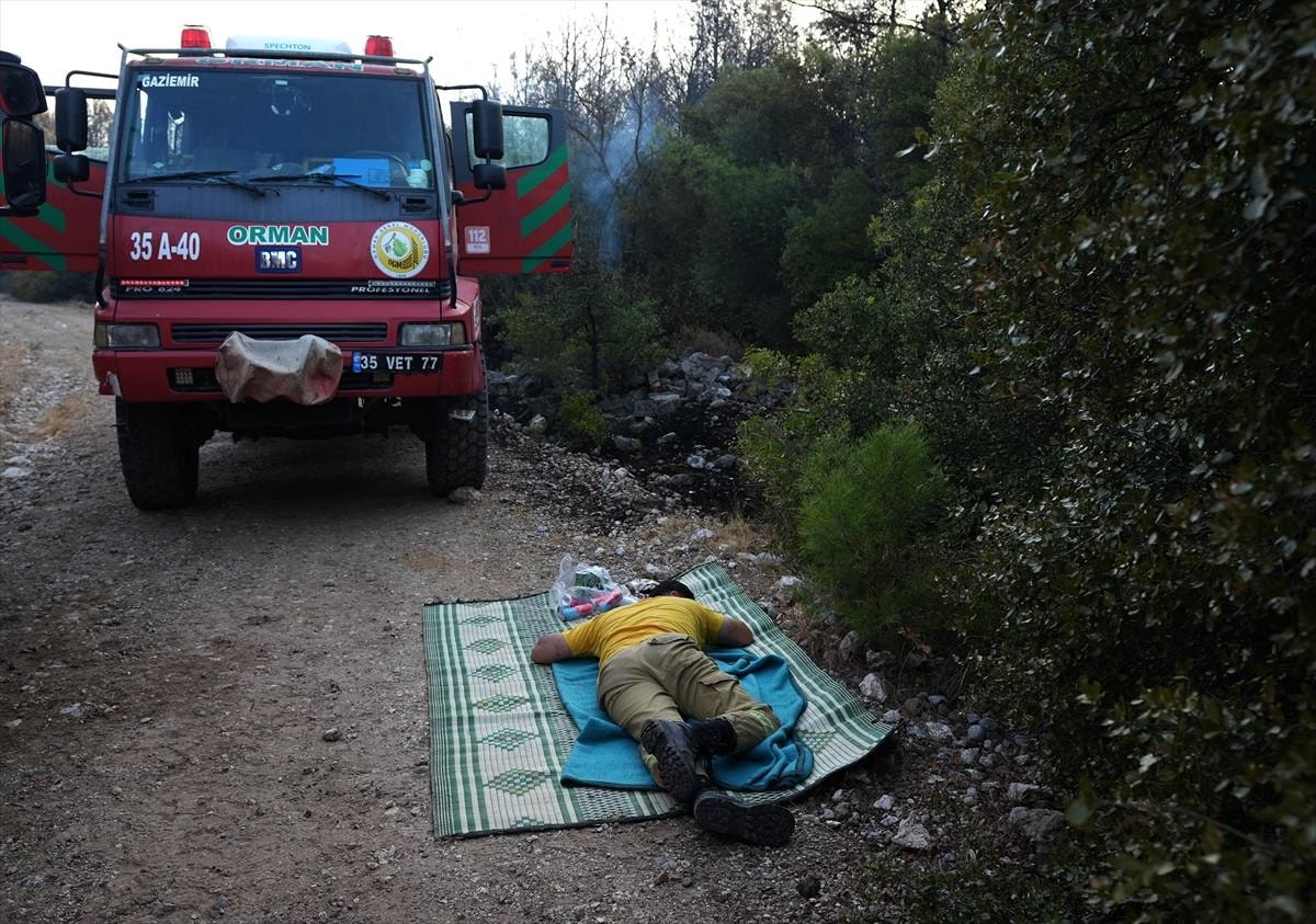 İzmir'de yangınla mücadele eden Orman Kahramanlarının yorgun düştüğü ve yorgunluktan bulundukları yerde uyudukları anlar görüntülendi.