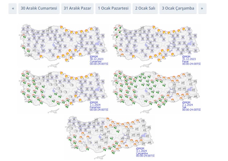 Yılbaşında ve 2024 yılının ilk günlerinde plan yapmaya hazırlananlar, hava durumuna dair detayları araştırıyor. Meteoroloji Genel Müdürlüğü ise beş günlük hava tahmin raporunu paylaşarak, vatandaşları bilgilendirdi.