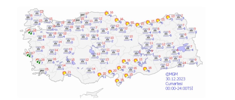 31 Aralık 2023 - 1 Ocak 2024 arasında bazı illerde beklenen hava durumu şöyle: