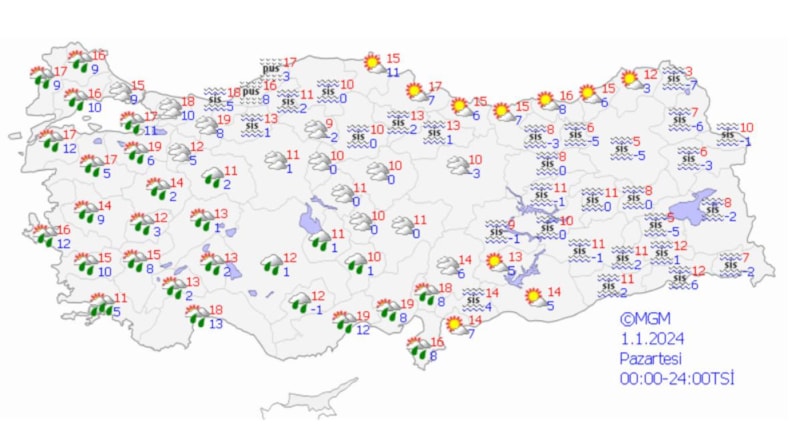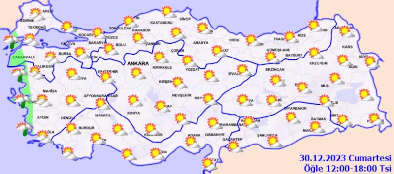 Meteoroloji Genel Müdürlüğü'nden yapılan açıklamaya göre; yılbaşında ve 2024'ün ilk günlerinde Türkiye'nin genellikle yüksek basınç merkezinin etkisi altında kalması, yurdun batı kesimlerinde hafif ve orta kuvvette yağmur, diğer bölgelerde parçalı az bulutlu ve yağışsız bir havanın etkili olması tahmin ediliyor.