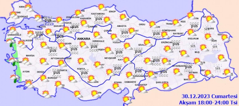 Marmara ile iç ve doğu kesimlerde yer yer yoğun olmak üzere pus ve sis hadisesi bekleniyor.