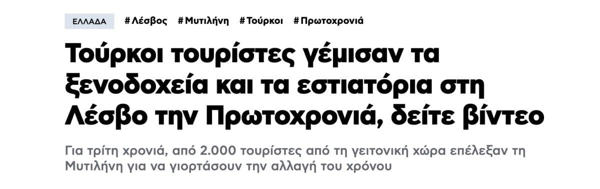 Protothema, "Türk turistler yılbaşı gecesi Midilli'deki otelleri ve restoranları doldurdu. Komşu ülkeden 2 binden fazla turist, bir kez daha yılbaşı kutlamaları için Yunan adasını tercih etti. Türklerin varlığı nedeniyle Midilli'deki otellerin neredeyse tamamı doldu.