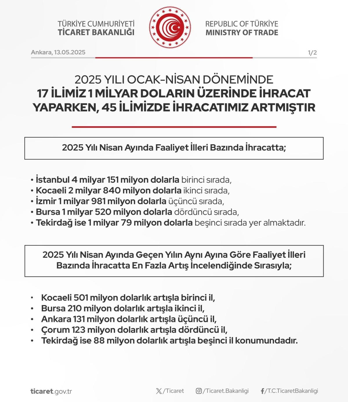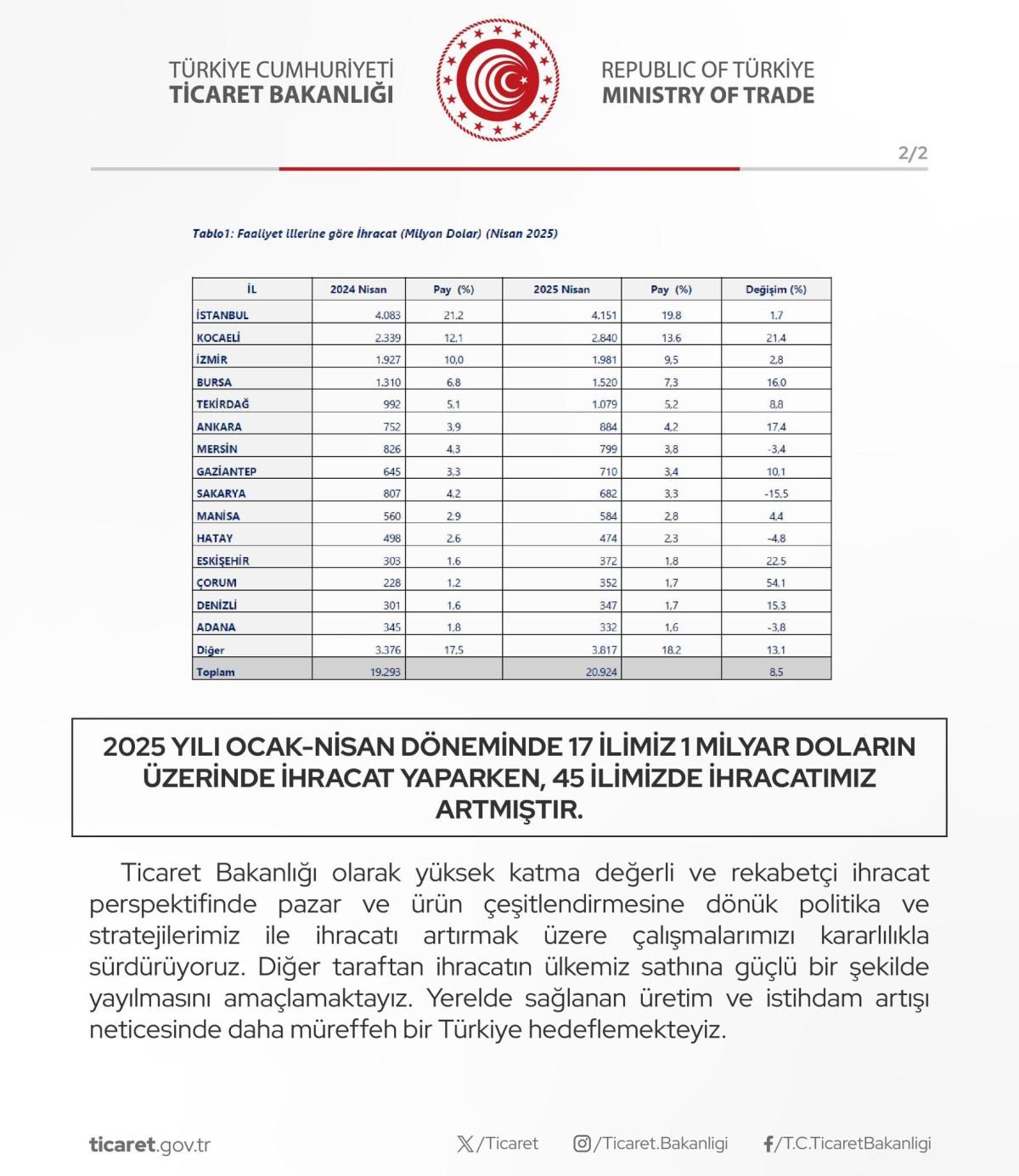 Ticaret Bakanlığı, 2025 yılı Ocak-Nisan dönemine ilişkin ihracat verilerini açıkladı.