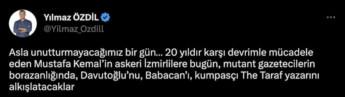 “Asla unutturmayacağımız bir gün… 20 yıldır karşı devrimle mücadele eden Mustafa Kemal’in askeri İzmirlilere bugün, mutant gazetecilerin borazanlığında, Davutoğlu’nu, Babacan’ı, kumpasçı The Taraf yazarını alkışlatacaklar.”