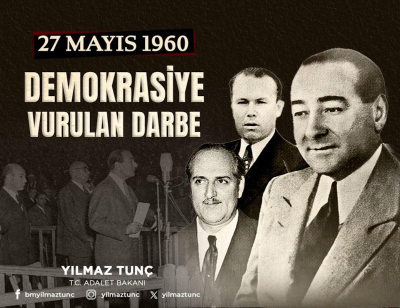 Adalet Bakanı Yılmaz Tunç, 27 Mayıs darbesine ilişkin X hesabı üzerinden yaptığı paylaşımda, 27 Mayıs 1960 darbesinin, Türk demokrasi tarihinin kara lekelerinden biri olduğunu belirtti.