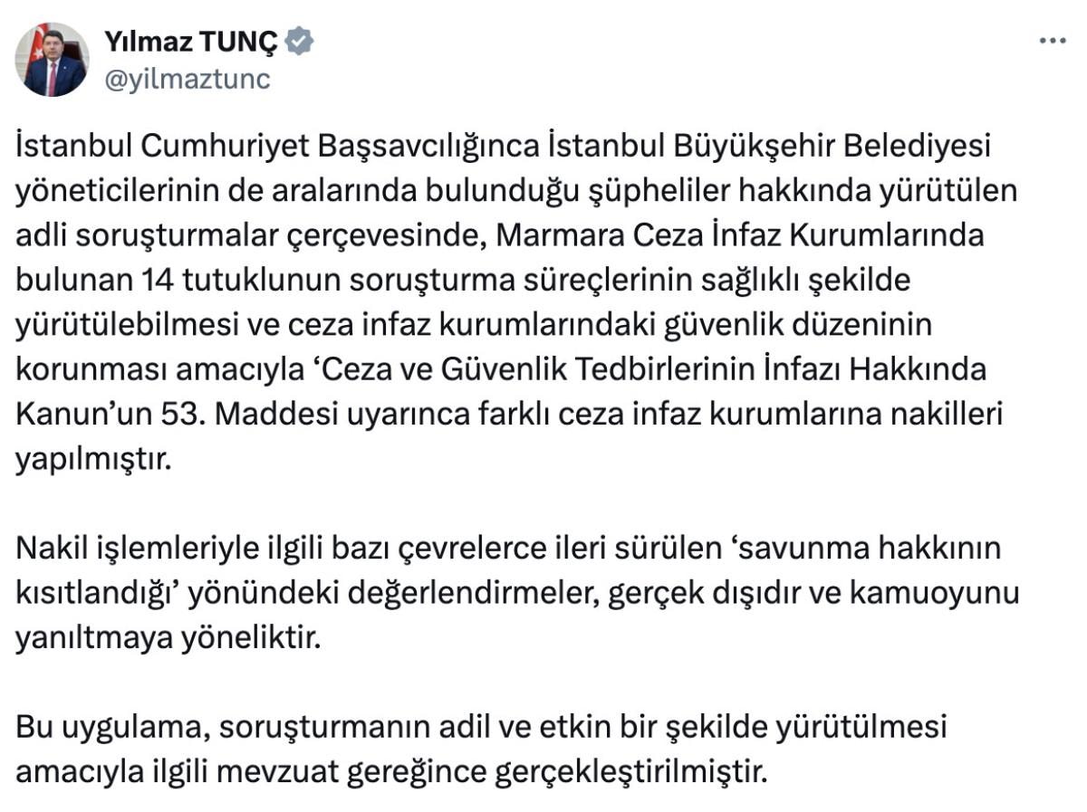 Yaşanan bu gelişmenin ardından açıklama yapan Adalet Bakanı Yılmaz Tunç, "İstanbul Cumhuriyet Başsavcılığınca İstanbul Büyükşehir Belediyesi yöneticilerinin de aralarında bulunduğu şüpheliler hakkında yürütülen adli soruşturmalar çerçevesinde, Marmara Ceza İnfaz Kurumlarında bulunan 14 tutuklunun soruşturma süreçlerinin sağlıklı şekilde yürütülebilmesi ve ceza infaz kurumlarındaki güvenlik düzeninin korunması amacıyla ‘Ceza ve Güvenlik Tedbirlerinin İnfazı Hakkında Kanun’un 53. Maddesi uyarınca farklı ceza infaz kurumlarına nakilleri yapılmıştır.