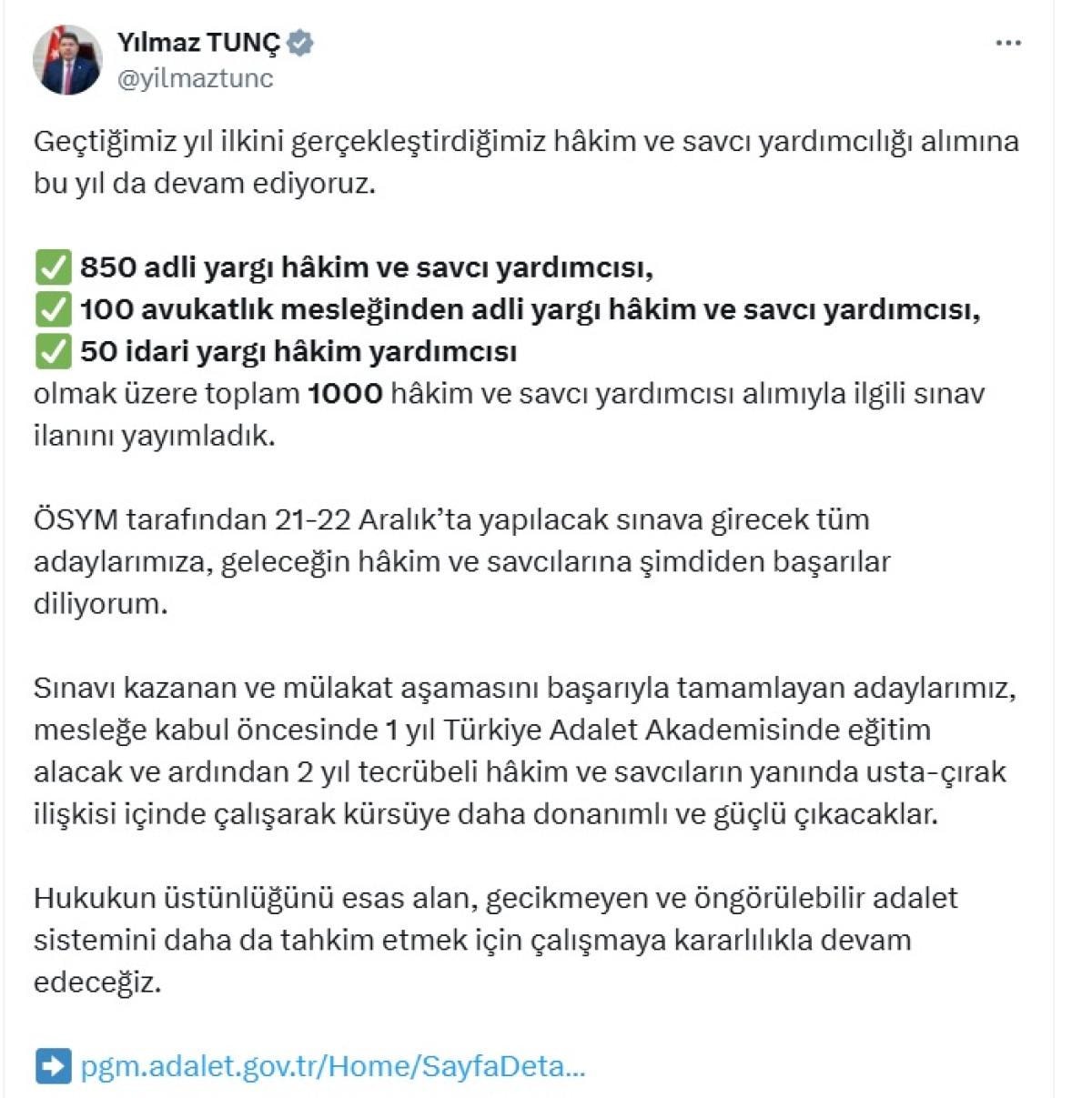 Hakim ve savcı yardımcısı alımına ilişkin bilgileri, Adalet Bakanı Yılmaz Tunç verdi.