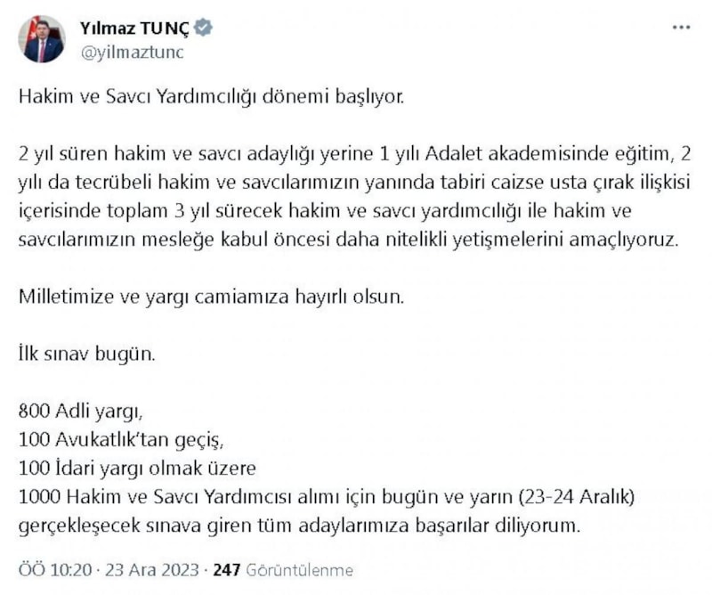 "Hakim ve savcı yardımcılığı dönemi başlıyor. 2 yıl süren hakim ve savcı adaylığı yerine 1 yılı Adalet Akademisi'nde eğitim, 2 yılı da tecrübeli hakim ve savcılarımızın yanında tabiri caizse usta-çırak ilişkisi içerisinde toplam 3 yıl sürecek hakim ve savcı yardımcılığı ile hakim ve savcılarımızın mesleğe kabul öncesi daha nitelikli yetişmelerini amaçlıyoruz. Milletimize ve yargı camiamıza hayırlı olsun. İlk sınav bugün. 800 adli yargı, 100 avukatlıktan geçiş, 100 idari yargı olmak üzere 1000 hakim ve savcı yardımcısı alımı için bugün ve yarın gerçekleşecek sınava giren tüm adaylarımıza başarılar diliyorum"