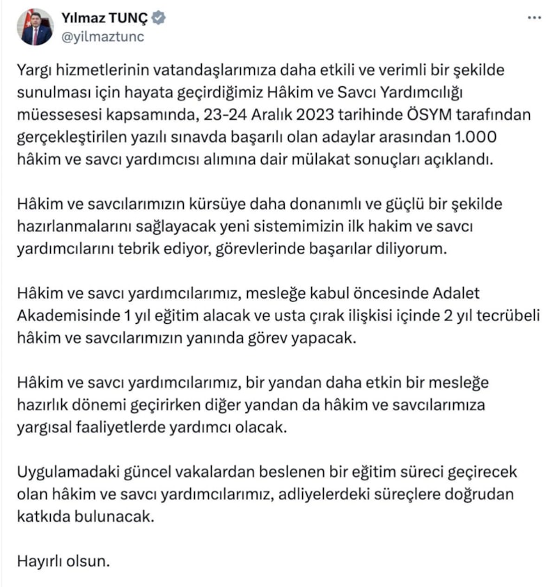 Bakan Tunç, sosyal medya hesabından yaptığı açıklamada, yargı hizmetlerinin daha etkili ve verimli sunulması için hayata geçirilen hakim ve savcı yardımcılığı müessesesi kapsamında, 23-24 Aralık 2023'te ÖSYM tarafından yazılı sınav gerçekleştirildiğini hatırlattı.