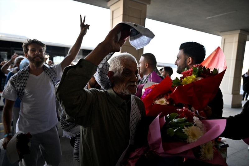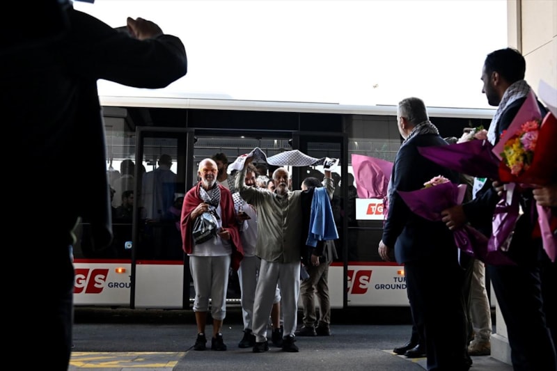 Bazı yetkililer ve çok sayıda kişi tarafından karşılanan aktivistler, kendilerini taşıyan uçaktan "Özgür Filistin" sloganlarıyla iniş yaptı.