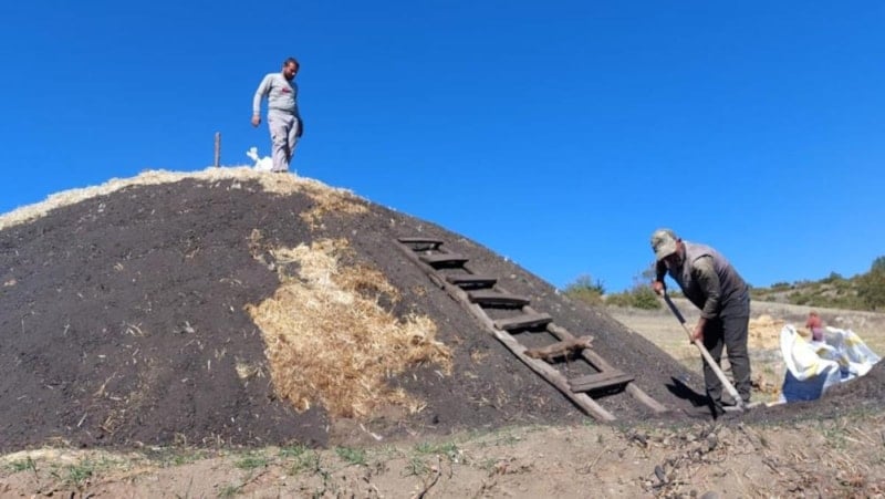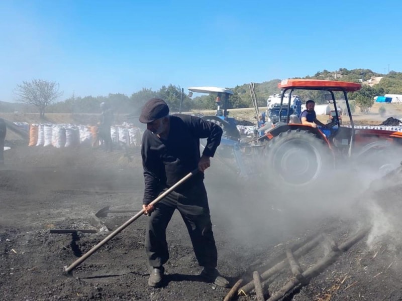 Kesilen meşeleri 2 ila 3 hafta kontrollü şekilde ocak başında nöbet tutarak yakan işçiler, daha sonra soğutma çalışması yapıyorlar.