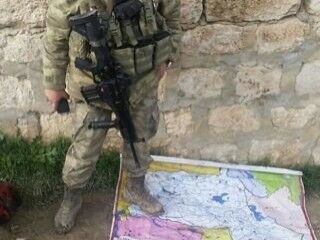 TSK ve ÖSO'nun ilerleyişi karşısında kaçmaktan başka çaresi kalmayan teröristlerin arkasında bıraktığı "Kürdistan" haritası da Türk askerinin ayakları altında yerini aldı.