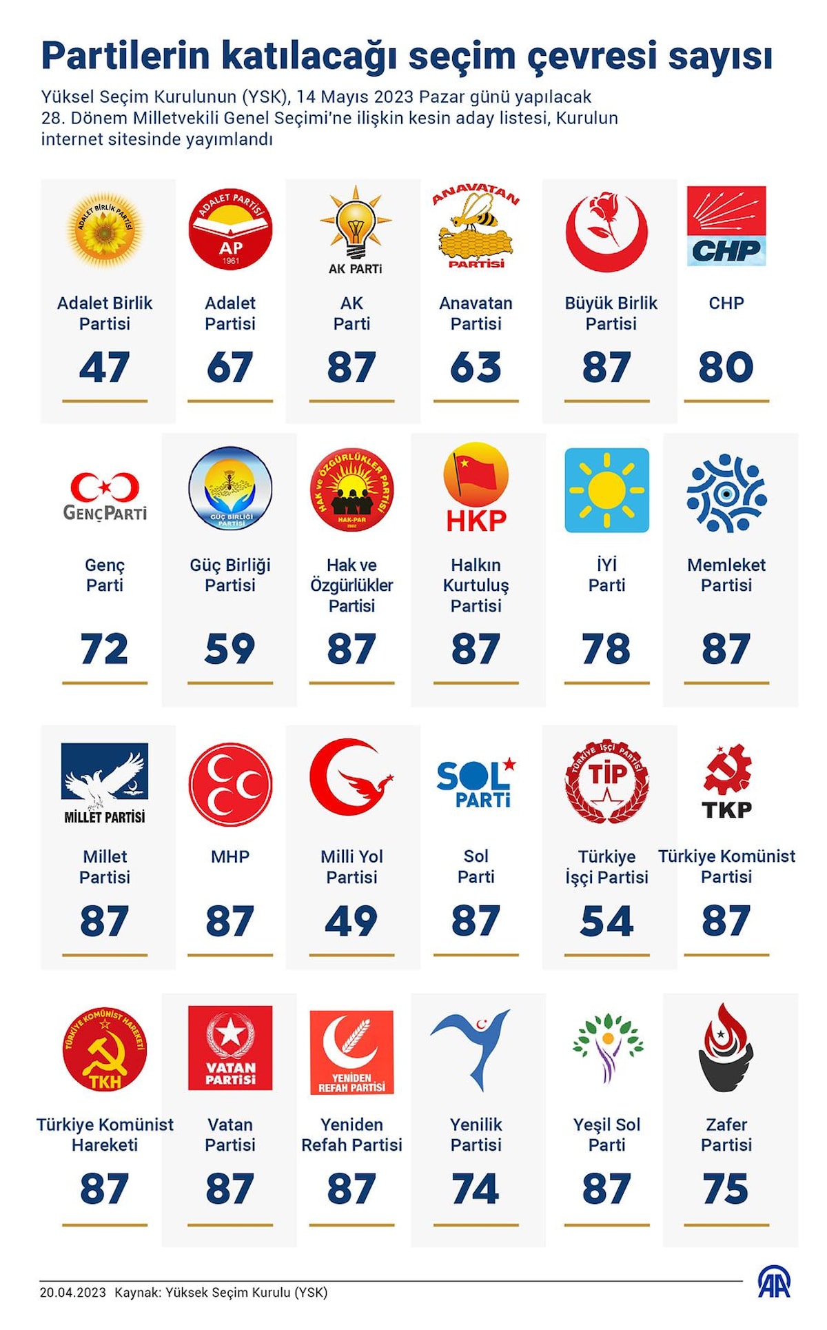 Buna göre; Adalet Birlik Partisi 47, Adalet Partisi 67, AK Parti 87, Anavatan Partisi 63, BBP 87, CHP 80, Genç Parti 72, Güç Birliği Partisi 59, Hak ve Özgürlükler Partisi 87, Halkın Kurtuluş Partisi 87, İYİ Parti 78, Memleket Partisi 87, Millet Partisi 87, MHP 87, Milli Yol Partisi 49, Sol Parti 87, Türkiye İşçi Partisi 54, Türkiye Komünist Hareketi 87, Türkiye Komünist Partisi 87, Vatan Partisi 87, Yeniden Refah Partisi 87, Yenilik Partisi 74, Yeşiller ve Sol Gelecek Partisi 87, Zafer Partisi 75 seçim çevresinde seçime katılacak.