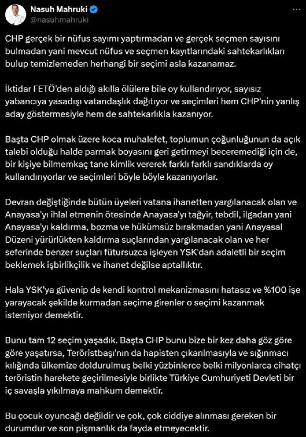 Mahruki, X hesabından yaptığı paylaşımda, Yüksek Seçim Kurulu (YSK) üyelerini yargılamakla tehdit etti ve hükümetin ölülere oy kullandırttığını ileri sürdü.