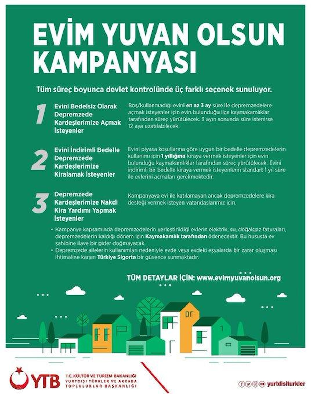 Yurt dışında yaşayan vatandaşların Türkiye’nin farklı yerlerinde kullanmadıkları veya boş evleri olduğunu ifade eden Eren, “Devletimiz boş veya kullanmadığınız evlerinizi depremden etkilenen insanlarımıza açmanız için bir proje başlattı. Bu kampanya sayesinde devletimizin gözetiminde evlerinizi depremden etkilenen insanlarımıza açabilirsiniz. Bu kampanyaya yurt dışındaki vatandaşlarımızın hepsinin katılmasını arzu ediyor, sizleri sevgi ile selamlıyorum.” dedi.