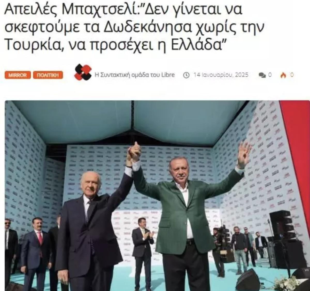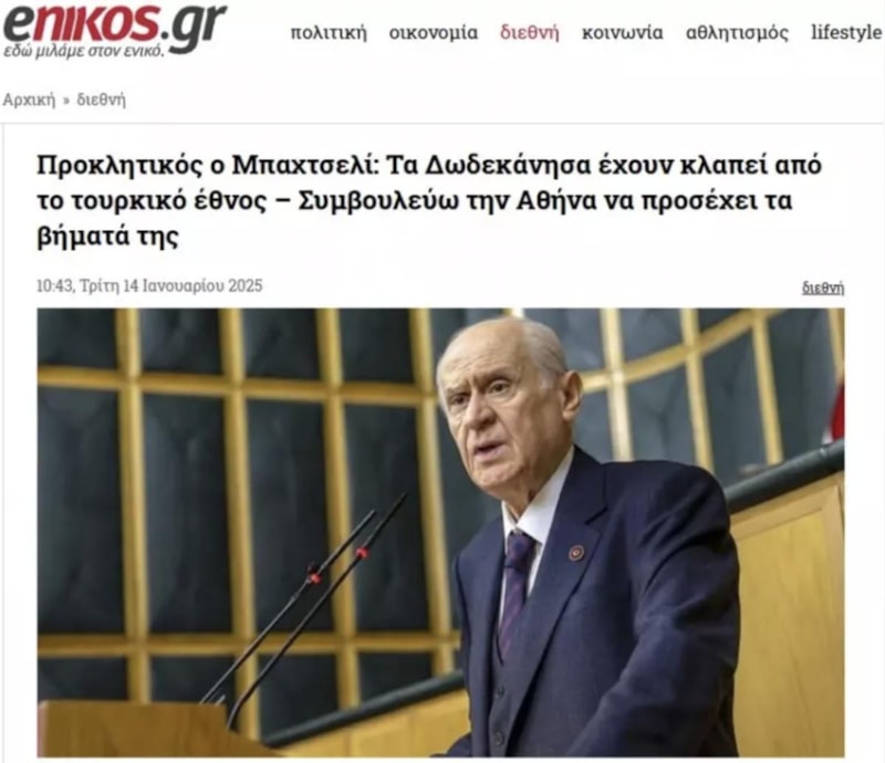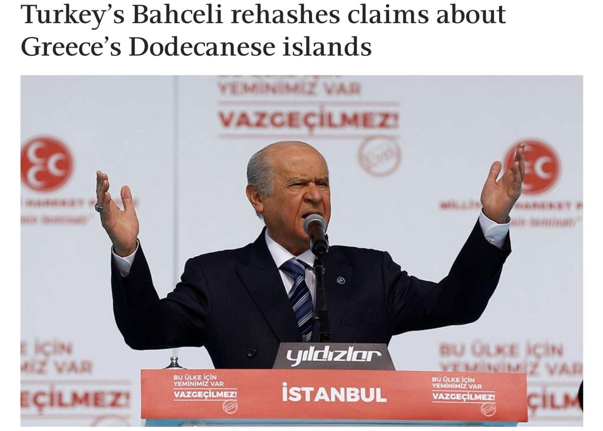 Enikos gazetesi ise Bahçeli'nin açıklamalarını, "Bahçeli oldukça kışkırtıcı: 12 Ada Türk milletinden çalınmıştır - Atina'ya adımlarını izlemesini tavsiye ediyorum." sözleriyle manşetlerinden verdi.