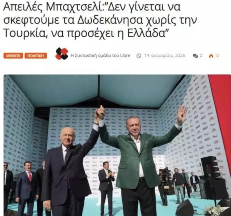 Gazete ayrıca, "Bahçeli, aynı söylemi sürdürerek Yunanistan'a “adımlarına dikkat etmesi” çağrısında bulundu. MHP'nin Genel Başkanı ve Erdoğan'ın hükümet ortağı Devlet Bahçeli, parti içi bir toplantıda kışkırtıcı açıklamalarda bulundu." ifadelerine de yer verdi.