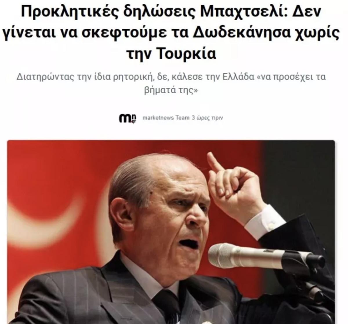 "Bahçeli, Yunanistan'ın eylemlerinin sonuçları ağır olacaktır" tehdidinde bulundu. Türkiye Cumhurbaşkanı'nın hükümet ortağı ve aşırı sağcı MHP Lideri Devlet Bahçeli, 12 Ada'yı doğrudan hedef tahtasına koyarak provokatif bir tutum sergiledi.