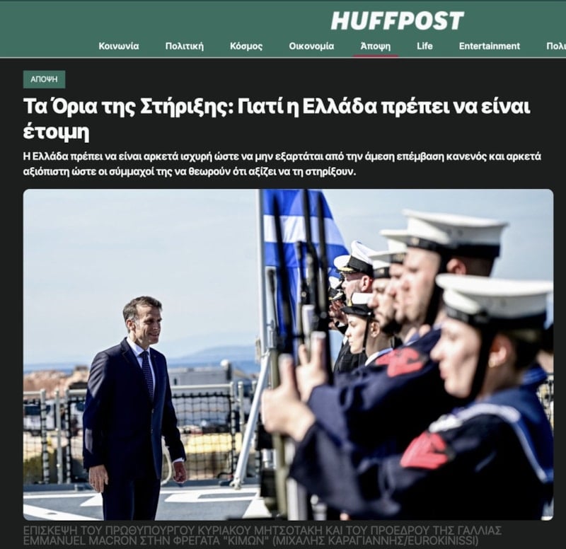 Yunanistan–Fransa savunma anlaşmasının yakın zamanda yenilenmesinin Yunan çıkarlarının ilerletilmesi açısından olumlu bir gelişme olduğunu belirten yazıda, Macron'un açık desteğinin Türkiye karşısında yeterli olmadığına dikkat çekildi.